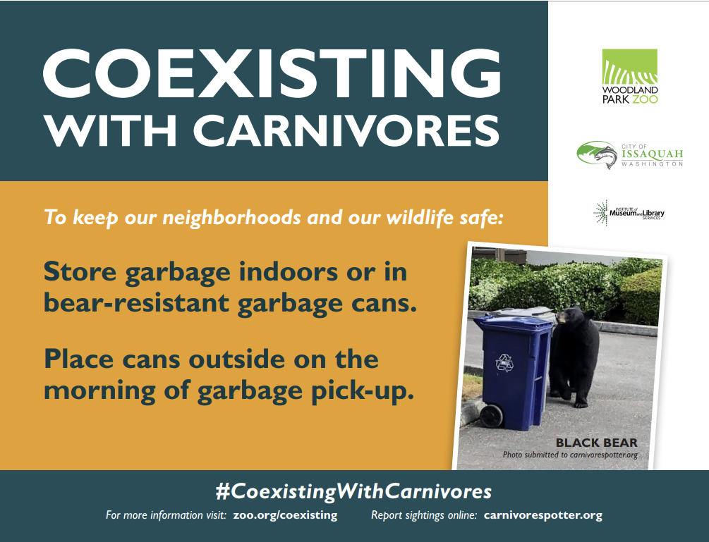 Issaquah Alps Trails Club (IATC) has partnered with the Woodland Park Zoo’s Coexisting with Carnivores program. This community education and engagement program seeks to equip local residents with knowledge and resources about the large carnivores and other wildlife that are found in the area. The program also helps people learn how to coexist and have positive interactions with their neighboring wildlife!