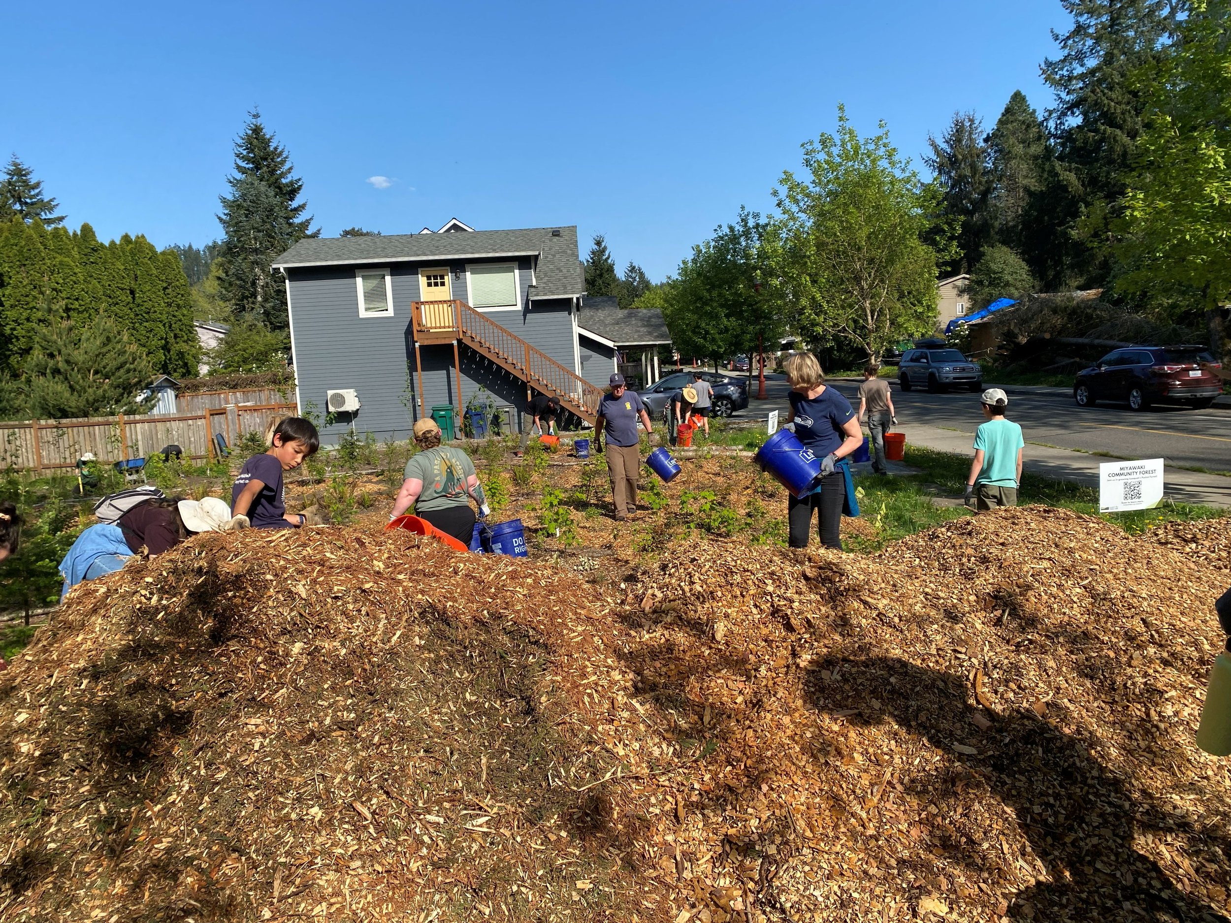 Along with serving as a hub for biodiversity and carbon capture, our Miyawaki forest is a place for community. Over the past year, the City of Issaquah and the Issaquah Alps Trails Club have hosted 11 work parties, with volunteers dedicating 340 collective hours to building and improving our forest. These community members worked to plant 880 shrubs and trees, spread 35 cubic yards of mulch, and water our newly established pocket forest.