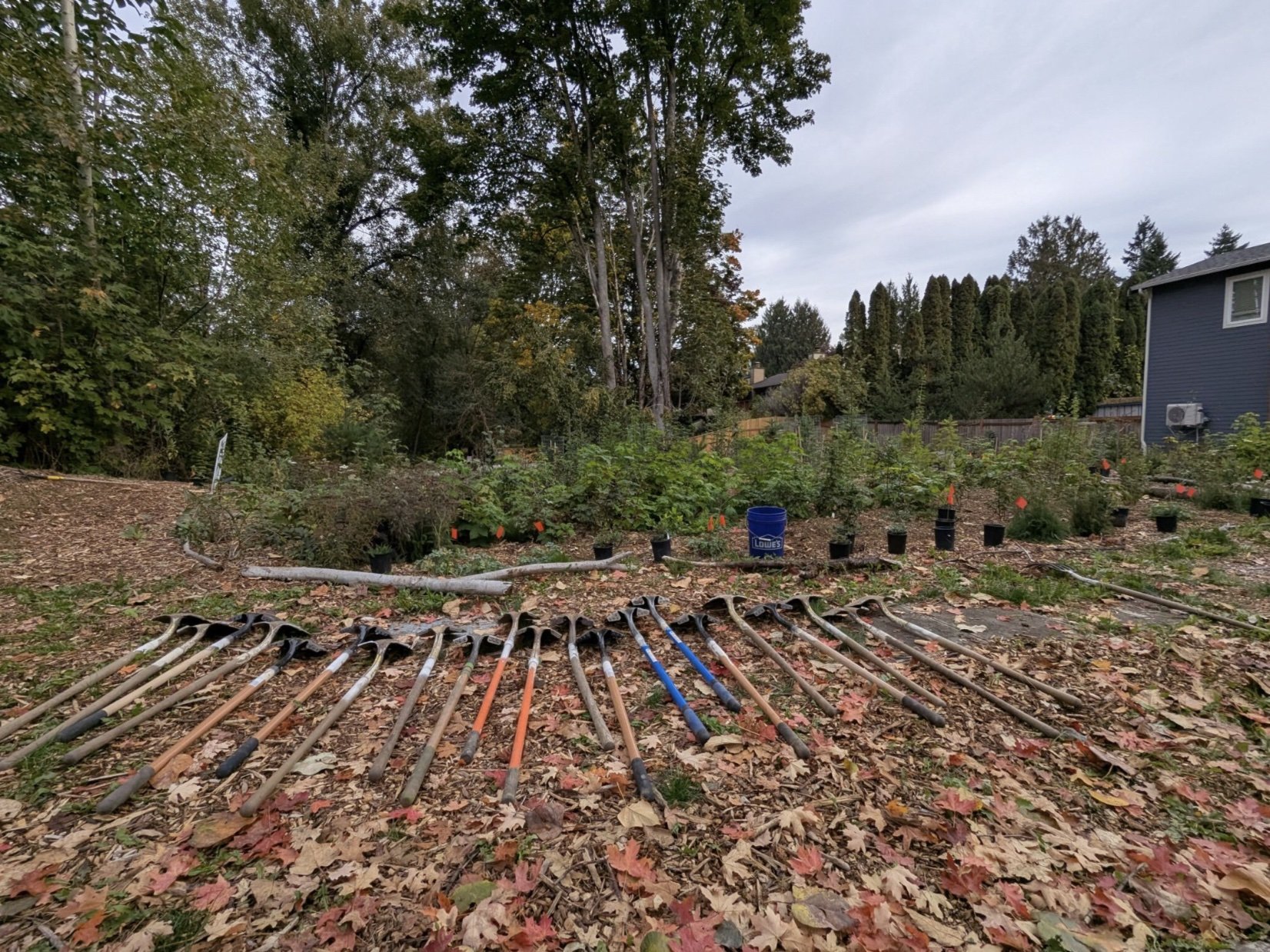 Our Miyawaki Forest this fall, thriving after a summer of mulching, caging, and our fall planting.