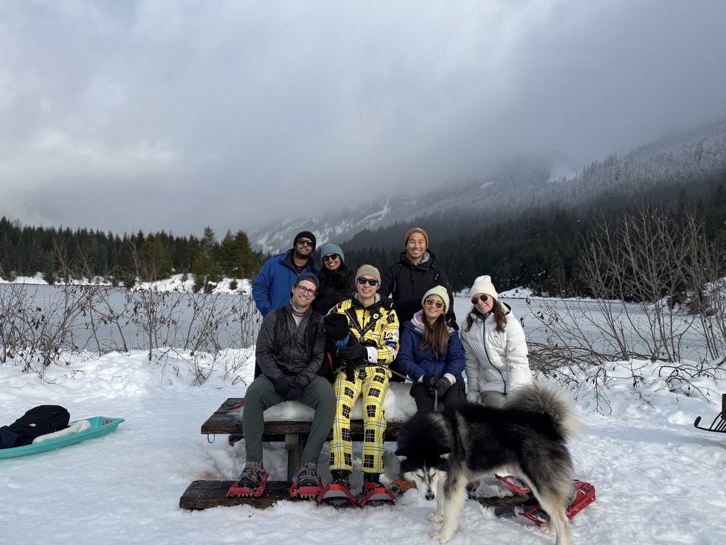 Snowshoeing with friends at Gold Creek Pond, with a golden suit. Photo courtesy of James Li.